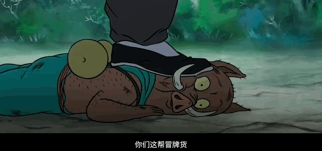 影片开局,小猪妖一脸凶神恶煞,勒索砍柴人,标准的“恶妖欺人”模式,但很快小猪妖就被小乌鸦欺负,和砍柴人一起可怜巴巴跪在一旁。